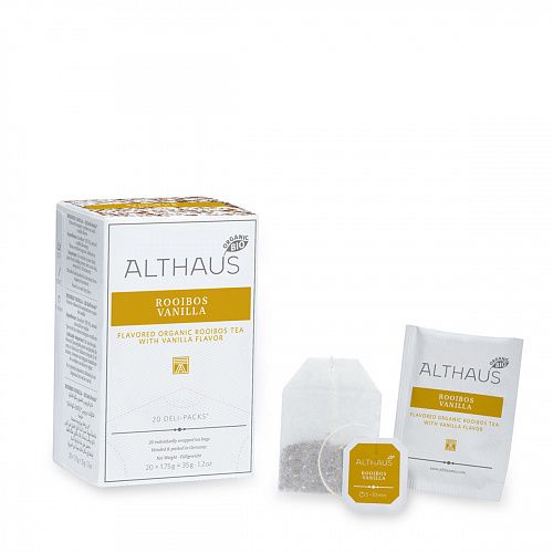 Rooibos Vanilla | Ройбуш ваниль Привлекательный аромат ванили придает легкие сладкие нотки органическому ройбушу. Этим натуральным бескофеиновым напитком можно наслаждаться целый день. Состав: Ройбуш (95 %), ароматизатор пищевой „Ваниль“. Привлекательный аромат ванили придает легкие сладкие нотки органическому ройбушу. Этим натуральным бескофеиновым напитком можно наслаждаться целый день. Состав: Ройбуш (95 %), ароматизатор пищевой „Ваниль“.