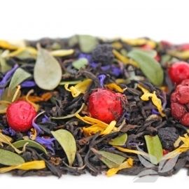 Черный цейлонский чай с добавлением ягод брусники, черноплодной рябины, цельных ягод ежевики, лепестков календулы, василька и брусничного листа. Этот чай богат всеми необходимыми для человека витаминами и минералами. При заваривании этот чай дает настой темно-коричневого цвета с приятным свежим вкусом и ароматом таежных ягод.