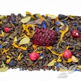 Зеленый китайский чай ганпаудер с добавлением ягод брусники, черники, голубики, цельных ягод ежевики, лепестков календулы, василька и брусничного листа. Этот чай богат всеми необходимыми для человека витаминами и минералами. При заваривании этот чай дает настой светло-зеленого цвета с приятным свежим вкусом и ароматом таежных ягод.