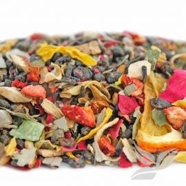 Зеленый китайский чай ганпаудер с добавлением кусочков кокосового ореха, долек апельсина и ананаса, цветов апельсинового дерева, лепестков подсолнечника, кусочков ананаса, киви и дикой клубники, цедры апельсина, листьев ежевики и лепестков чайной розы. Приятный и нежный вкус этого чая богат свежестью и экзотикой. При заваривании дает настой светло-зеленого цвета со вкусом тропических фруктов.