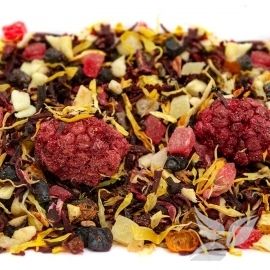 Смесь суданской розы, кусочков яблок, груши, папайи, дыни, кожуры шиповника с добавлением ягод клюквы, брусники, барбариса, ежевики, черники, цедры сицилийского апельсина и лепестков календулы.
