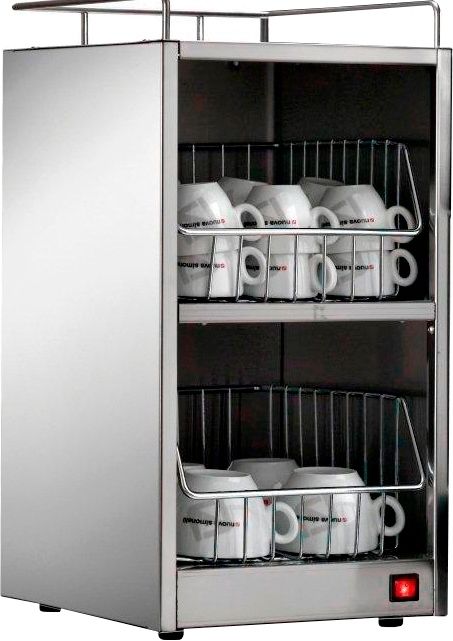 Подогреватель чашек Изготовлен из полированной нержавеющей стали. 2 полки с выдвижными корзинами, наличие регулировки температуры подогрева Вместимость -12 чашек эспрессо и 24 капучино; Габариты: Ш250х Гл300х В480 мм, вес 7,3 кг; 230В, 300 Вт.