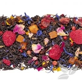 Черный чай с ягодами малины и годжи, кусочками клубники и персика, розовым перцем, цветками тибетской ромашки, лепестками василька и розы. Прекрасное сочетание терпкости черного чая и сладости любимого малинового десерта.